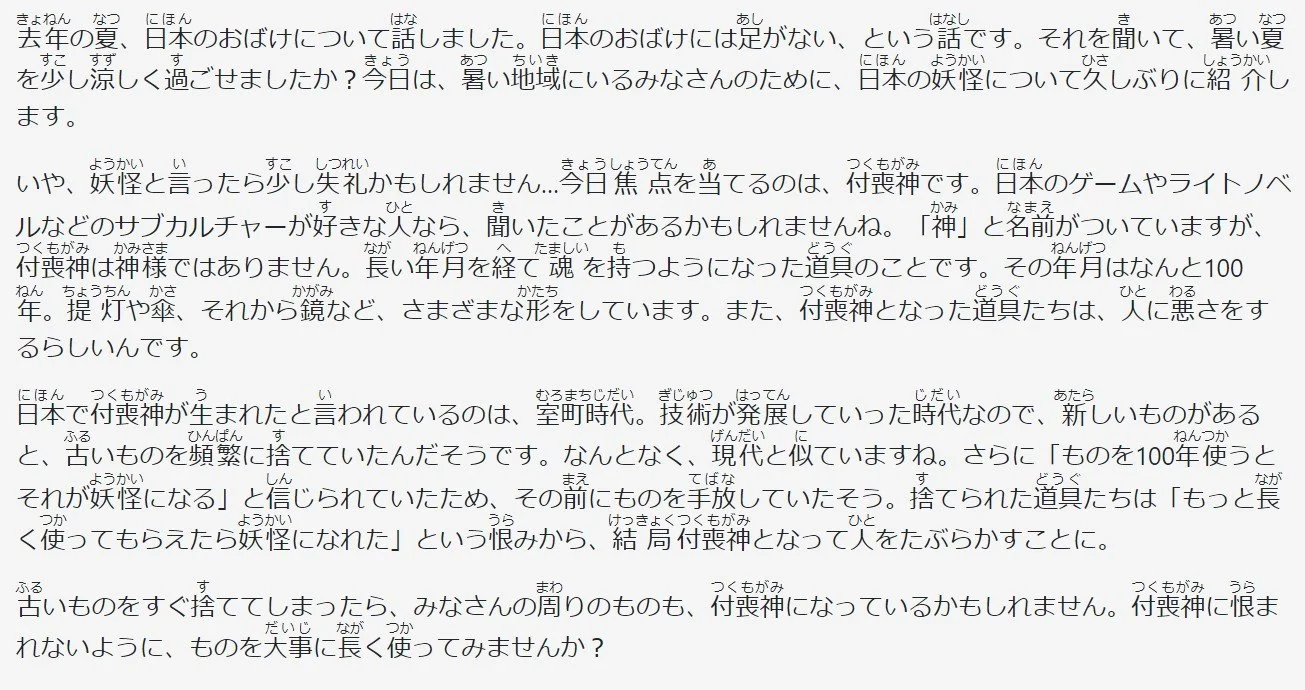 去年の夏、日本のおばけについて話しました。日本のおばけには足がない、という話です。それを聞いて、暑い夏を少し涼しく過ごせましたか?今日は、暑い地域にいるみなさんのために、日本の妖怪について久しぶりに紹介します。
